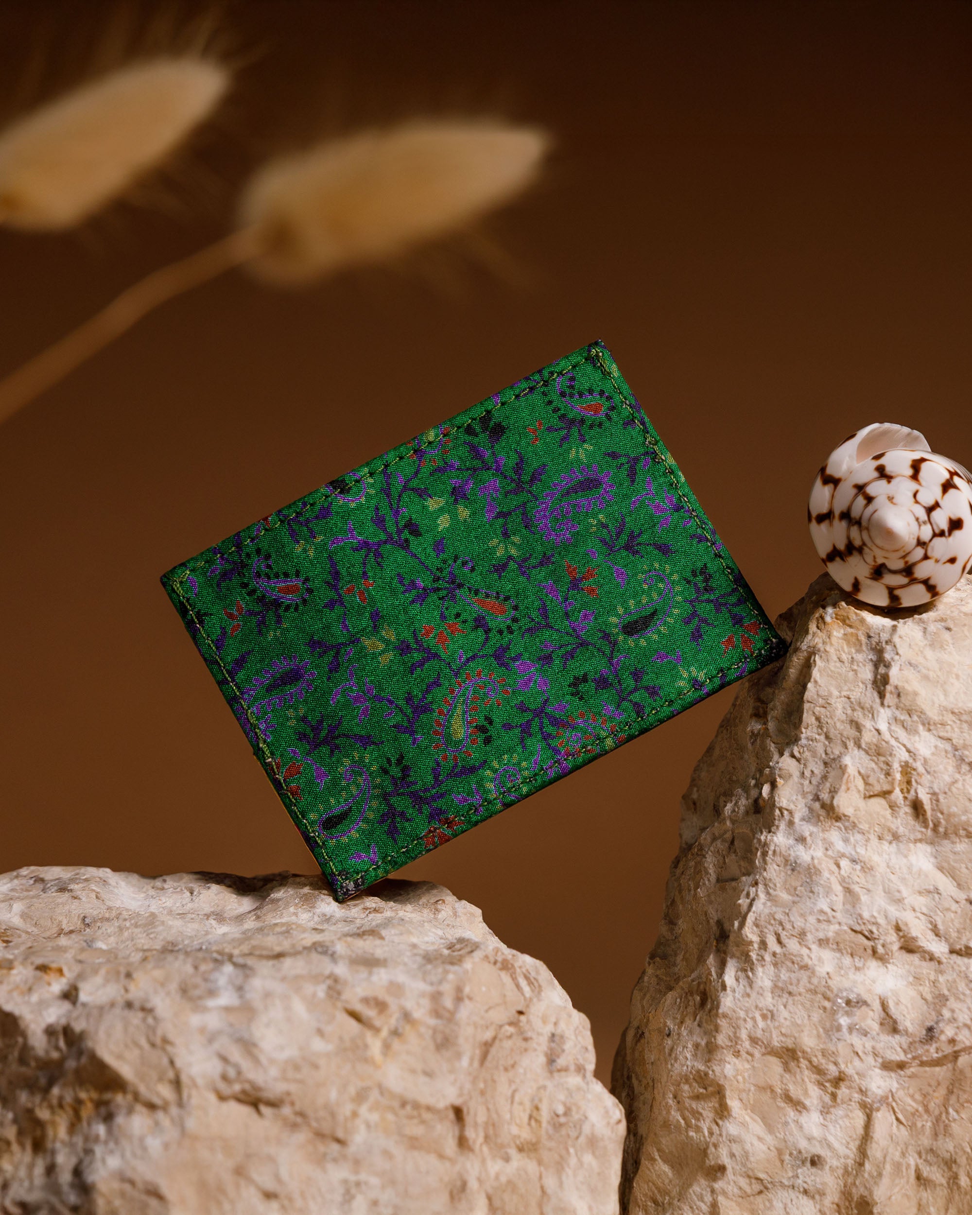 - Deep green with purple and mauve colored paisleys