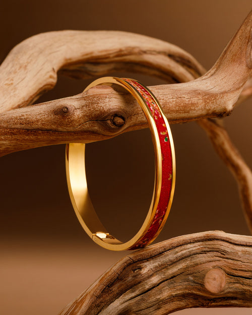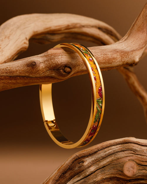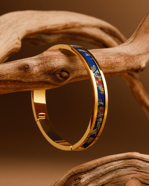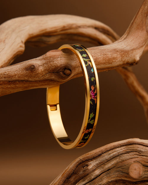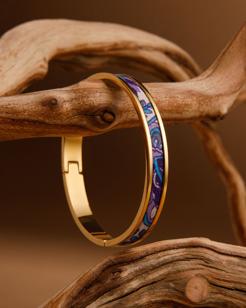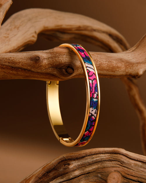 An elegant narrow bangle designed with a colorful silk center. Adorn your wrist with a single bangle or stack them on. Make this your new everyday accessory.